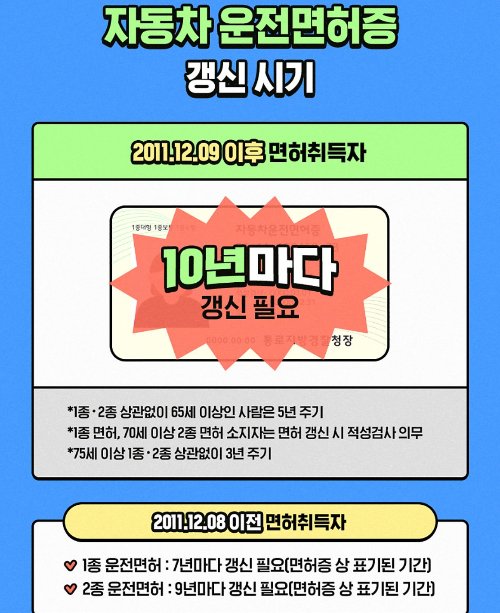 한편 제1종 면허 소지자는 나이에 따라 정기적성검사를 병행해야 하며 특히 70세 이상 또는 65세~75세 사이의 운전자는 갱신 주기에 맞춰 신체검사 또는 건강검진 결과지를 제출해야 합니다.